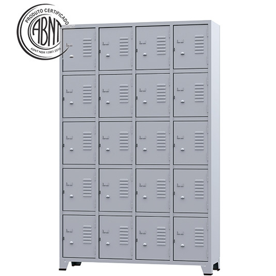 Armário Roupeiro de aço para vestiário, produzido em aço chapa 26 0,45 mm, possui 20 portas com venezianas para ventilação, compartimento de tamanho médio independentes sem divisórias internas, fechamento das portas através de pitão para cadeado.
